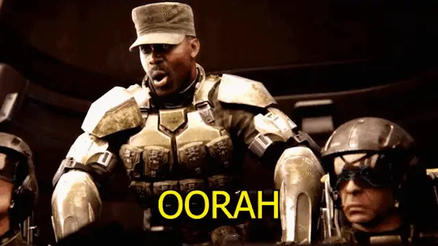 The iconic red United States Marine Corps emblem with an eagle, globe, and anchor, accompanied by the motivational cheer 'OOHRAH'.
