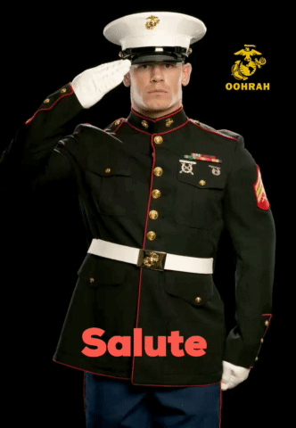 A man in a US Marine Corps uniform performs an Oorah salute, with 'Salute' and 'OORAH' text.