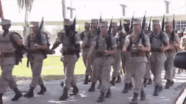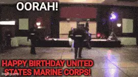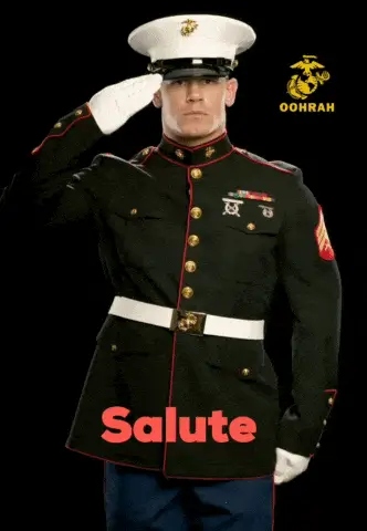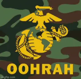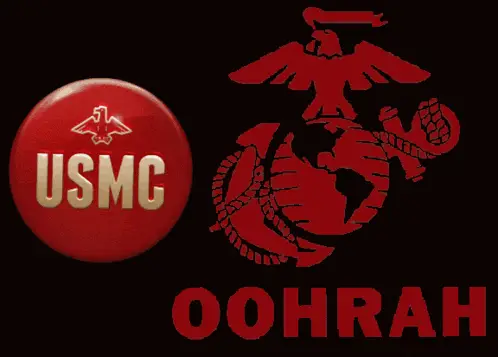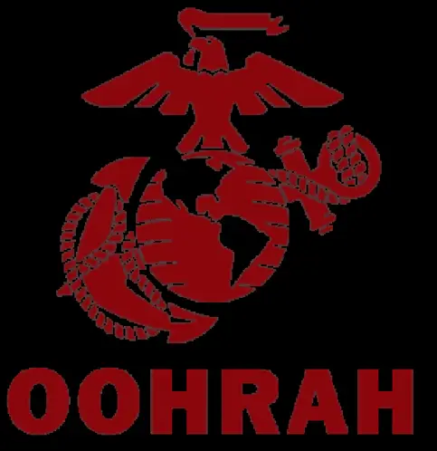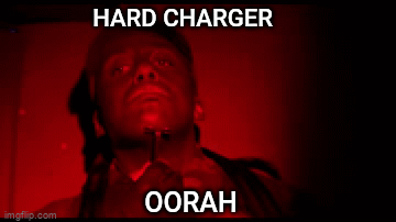 A man's face dramatically lit in red, with 'HARD CHARGER' and 'OORAH' text, referencing USMC culture.