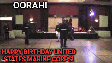Marines in uniform celebrate their birthday with energetic dancing, including a split and a flip, to the cheer of "OORAH!".