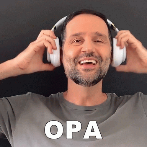 Adriano Bisker reacts with 'Opa' while putting on white headphones, showing his playful side.