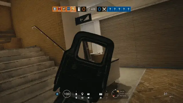 An animated character, a bandit or robber, bursts through a door holding two firearms, exclaiming 'Opa Cheguei'.
