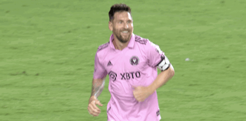 Lionel Messi celebrates with an iconic open arms gesture on the soccer field in his pink Inter Miami CF jersey.
