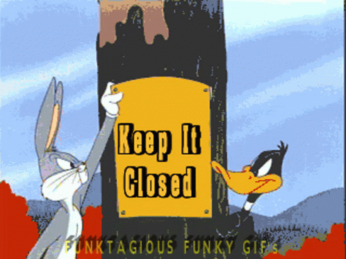Bugs Bunny and Daffy Duck react to an 'Open The Country' sign, with Daffy tearing it down.