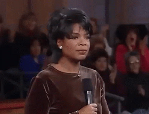 Oprah Winfrey reacts with shock and covers her face during a live show, surrounded by an excited audience.
