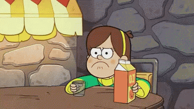 Mabel Pines from Gravity Falls pours and drinks orange juice, reacting with disgust to the taste.