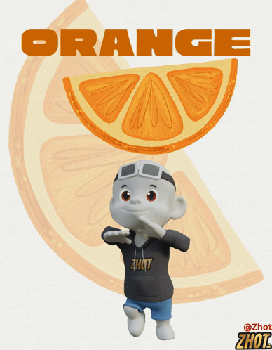 A cute cartoon character dances energetically in front of a large orange slice, with the word 'ORANGE' displayed.
