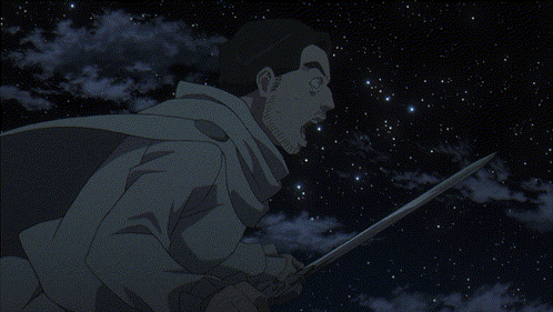 a man with a beard is holding a sword in the air