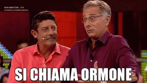 Paolo Bonolis and a man on Italian TV, with the phrase 'Si Chiama Ormone' displayed on screen.