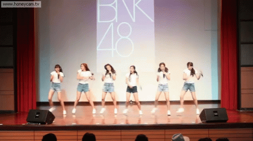 Orn BNK48 and fellow members perform a lively dance on stage in front of a BNK48 banner.