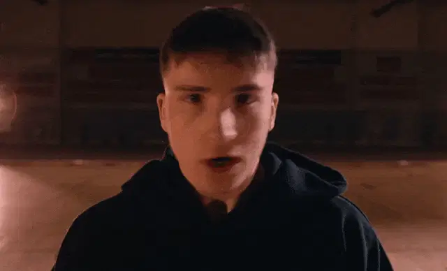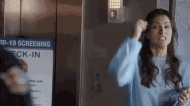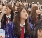 Orn from BNK48, wearing a striped uniform and red tie, salutes with a serious expression, appearing stressed.