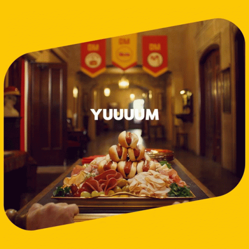 A lavish Oscar Mayer food spread featuring hot dogs and deli meats is presented, with 'YUUUUM' text appearing on screen.