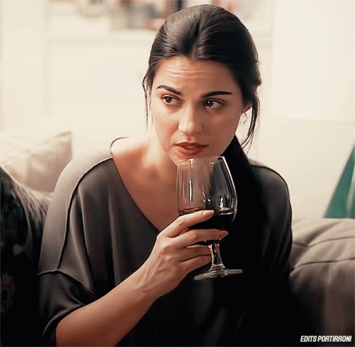 Maite Perroni as Alma Solares, from Oscuro Deseo, sits on a couch, thoughtfully sipping red wine.