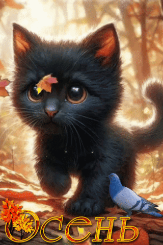 A charming black kitten with big eyes holds an autumn leaf, accompanied by a pigeon amidst falling leaves, with 'Autumn' text.