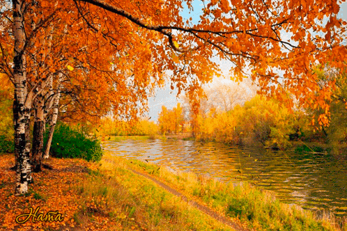 A beautiful autumn landscape featuring a serene river, vibrant orange birch trees, and falling leaves, signed 'Hama'.