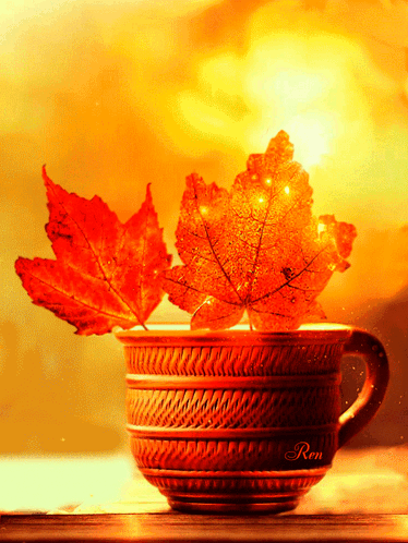 A cozy cup with vibrant autumn leaves, glowing with warm light, featuring 'Ron' on the side.