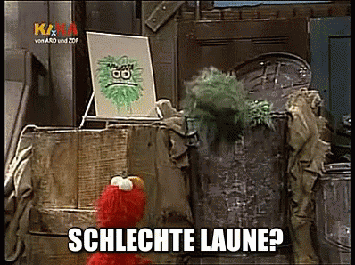 Elmo asks Oskar the Grouch if he's in a bad mood, as Oskar pops out of his trash can in Sesamstraße.
