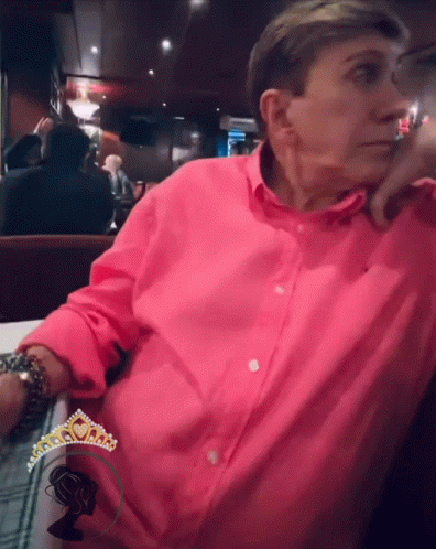 Osmel Sousa, wearing a pink shirt, reacts with surprise as he is offered a glass of red wine.