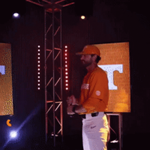 Tennessee Baseball coach Tony Vitello swings a bat amidst smoke and lights, celebrating the Vols' spirit.
