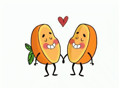 Two cute orange halves, the 'medianaranja' or 'other half', hold hands and share a kiss.