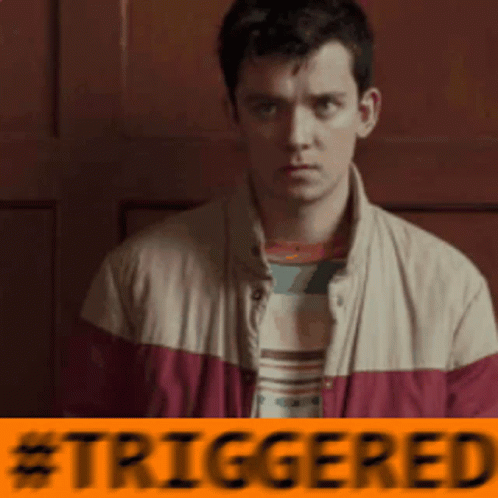 Otis stands in front of a sign displaying '#triggered', reacting to something unseen.