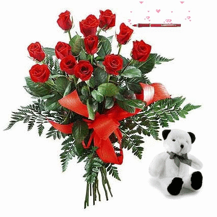 Открытка на день рождения с букетом и игрушкой