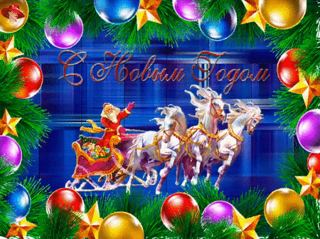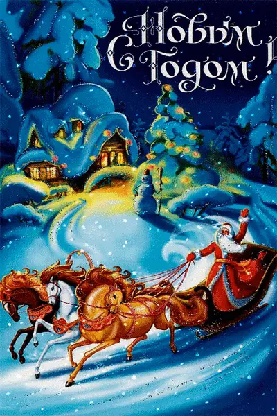 Открытка с дедом морозом на тройке лошадей