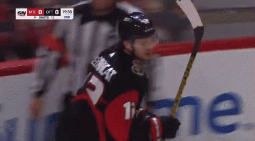 Ottawa Senators player Alex Debrincat celebrates after scoring a goal in an NHL game.