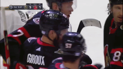 Claude Giroux celebrates a goal for the Ottawa Senators during an NHL game, with the score changing to 5-2.
