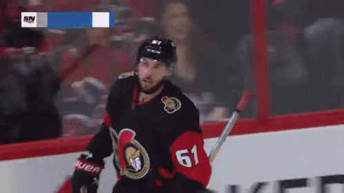Ottawa Senators player Derick Brassard (No. 61) celebrates a goal on the ice during an NHL game.