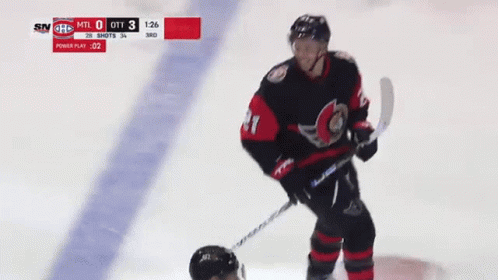 Mathieu Joseph celebrates after scoring a short-handed goal for the Ottawa Senators in a hockey game.