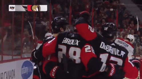 Ottawa Senators players celebrate a goal during an NHL hockey game.