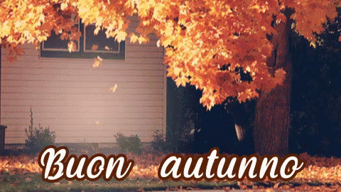 Autumn leaves falling in front of a house, with the Italian text 'Buon autunno' displayed.