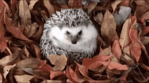 A small hedgehog is nestled among a pile of colorful autumn leaves, with the text "Happy autumn" displayed.