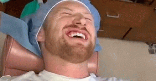 Scotty Sire reacts with a mix of pain and laughter in a dental chair, likely during a wisdom tooth procedure.