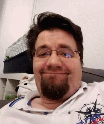 Man with glasses and goatee smiles at the camera, wearing a white polo shirt with a compass design.