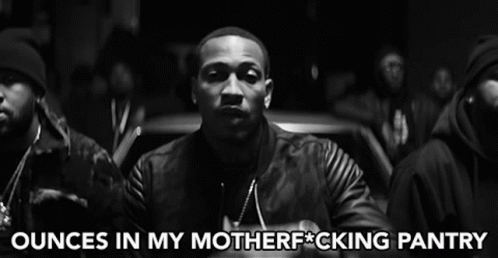 A man in a black jacket with the caption 'OUNCES IN MY MOTHERF*CKING PANTRY' from Trouble's music video.