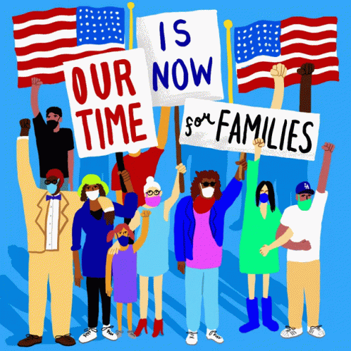 A diverse group holds protest signs 'Our Time Is Now For Families' under American flags, advocating for family rights.