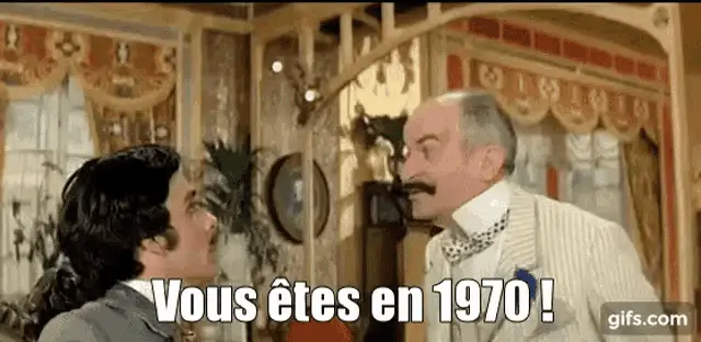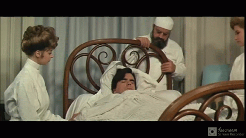 Michael Lonsdale wakes up in a bed, surrounded by people, asking "Où suis-je ?" in a scene from Hibernatus.
