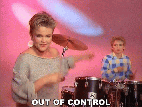 The Go Gos perform 'Out Of Control' with a lead singer passionately singing and playing drums in a vibrant 80s music video.
