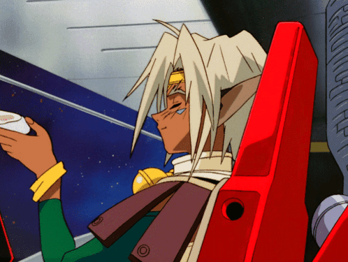 Aisha Clan Clan from Outlaw Star sits thoughtfully in a red chair, hand near her face.