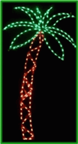 A collection of vibrant outside LED Christmas decorations, including a palm tree, intertwined hearts, a bunny, and a Christmas tree.