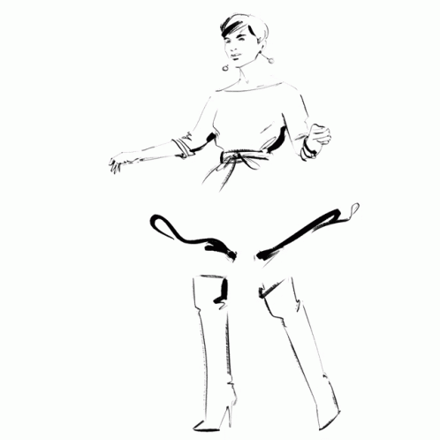 A stylish black and white fashion animation of a girl dancing and twirling in a short dress and over-the-knee boots.