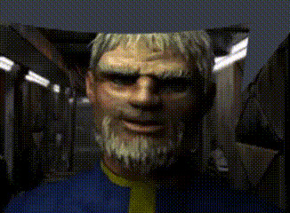 The pixelated Fallout Overseer character speaks in a hallway, reminiscent of classic video game graphics.