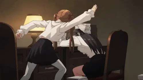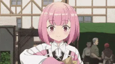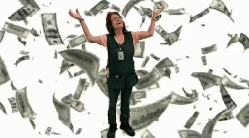 A woman in a work vest stands with arms raised as US dollar bills 'make it rain' around her.