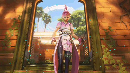 a woman in a pink dress is standing in front of a brick building
