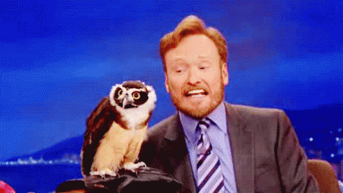 A man in a suit and tie reacts with surprise while holding a small owl on his gloved hand in a TV studio.