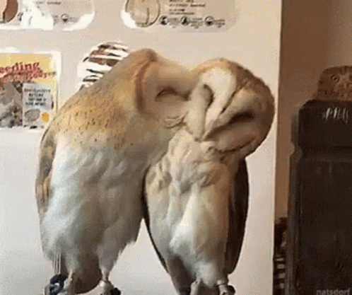 Two adorable barn owls share a tender moment, nuzzling each other affectionately.