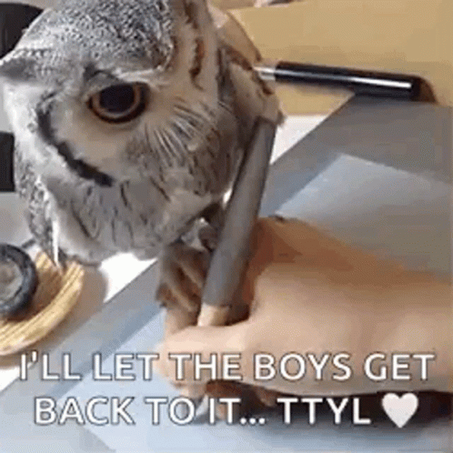 An adorable owl holds a pen in its beak, appearing to 'write' while interacting with a human hand.