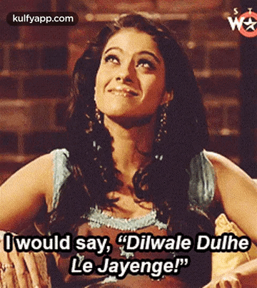Kajol enthusiastically declares the iconic line, 'Dilwale Dulhe Le Jayenge!' from the famous Bollywood film.